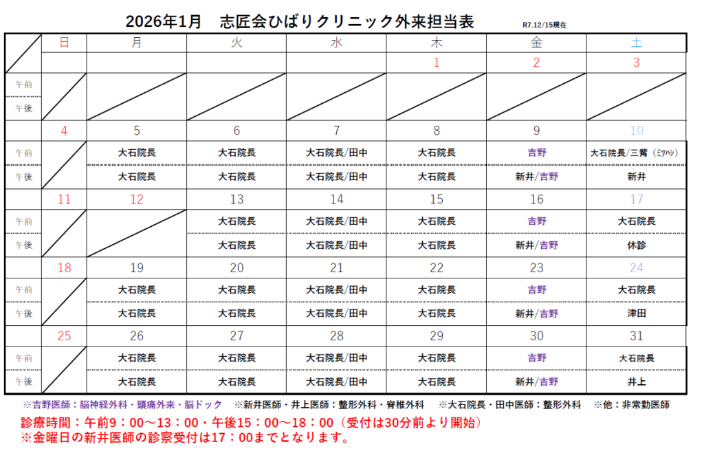 ※1月17日(土)【午後】クリニック休診となります。(午前は通常通り整形外科大石医院長外来)